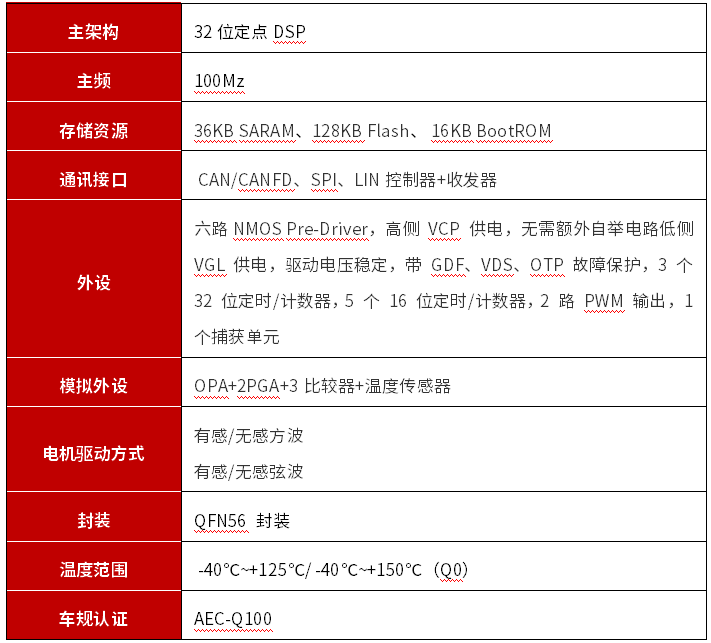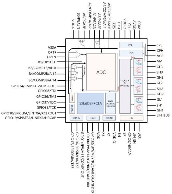 ADM32F036A3Q It is a 32-bit DSP vehicle grade improved version for motor control, integrating LDO, charge pump, and 6NMOS pre drive. It is equipped with a 100M main frequency 32-bit DSP processing core+CLA, enhanced control peripherals, CAN, CANFD, LIN (with transceiver), SPI, HRCAP modules, 12 bit ADC, voltage comparator, and temperature sensor; It can form a highly integrated motor control and drive core, directly driving power transistors to complete motor control, supporting multiple modes such as inductive, non inductive, square wave, and sine wave.