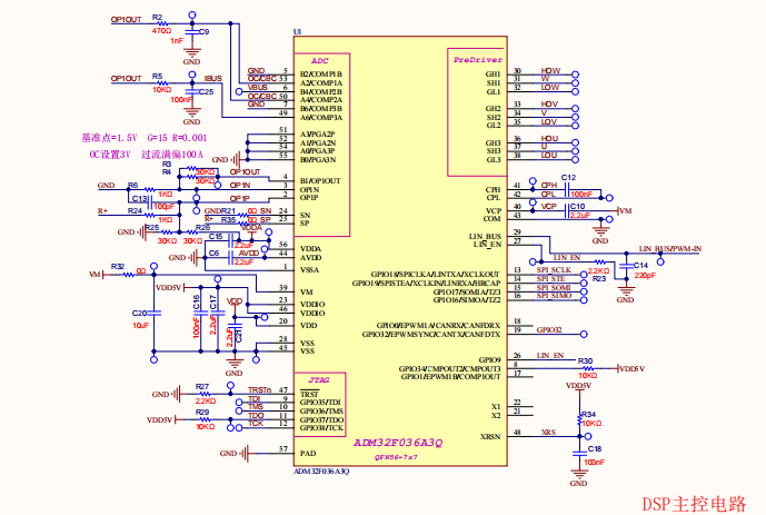 ADM32F036A3Q The minimum system is shown in the following figure, including JTAG interface, SPI, LIN/PWM input, etc. The built-in operational amplifier OPA of the