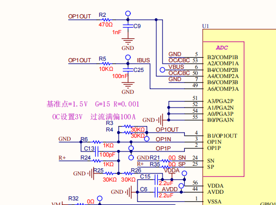 A single sampling resistor of 0.001R is connected to the independent operational amplifier circuit of OP1 in ADM32F036A3Q through differential wiring, and the operational amplifier is input to the chip port for sampling and operation.