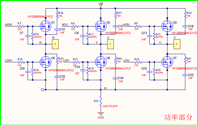 The power bridge circuit adopts a configuration where both upper and lower transistors are NMOS,A total of 6 NMOS are used to form a three-phase H-bridge driving circuit.